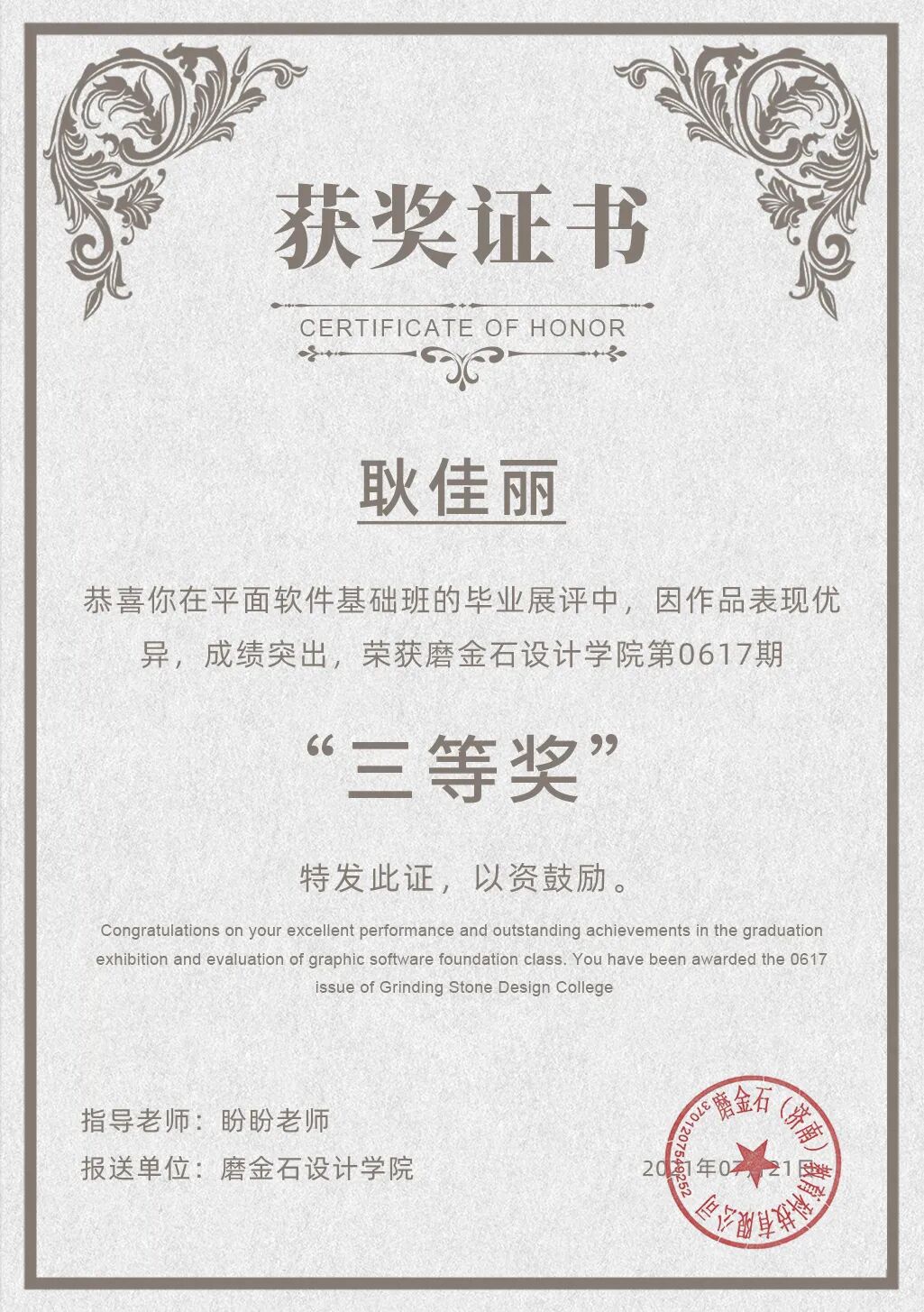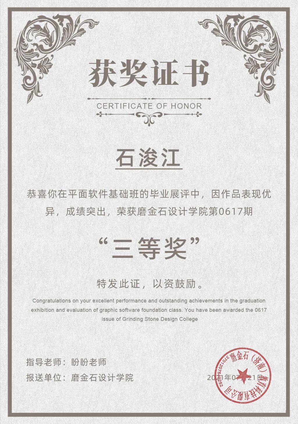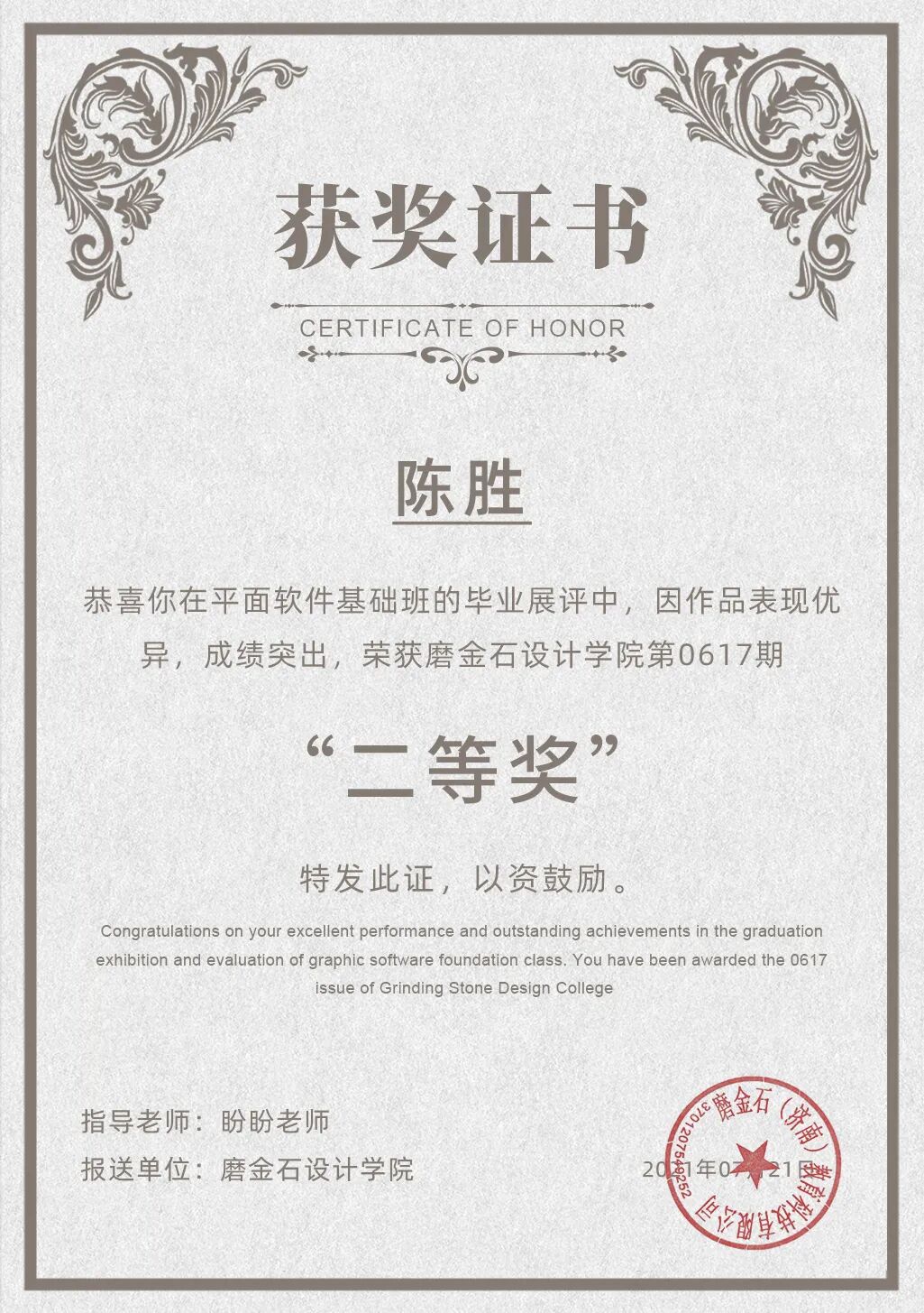 平面设计学院0617第一阶段助学培优计划评选一等奖获得者:平面设计学院0617第一阶段助学培优计划评选二等奖获得者:平面设计学院0617第一阶段助学培优计划评选三等奖获得者:通过参赛评选学员不断学习创新,提高学习水平和学习质量,创作更有含金量、更具标志性的作品。根据助学评优条例的规定,评选遵循“公平、公正、公开”原则,对0617第一阶段学员进行了集中的讲师及大众评审。希望获奖的同学珍惜荣誉,谦虚谨慎,再接再厉,再创佳绩。希望其他同学向获奖同学看齐,以创作力技能为最终学习目标,没有获奖的同学,不要以最终奖励为根本,你的努力与汗水正是你的荣耀见证。